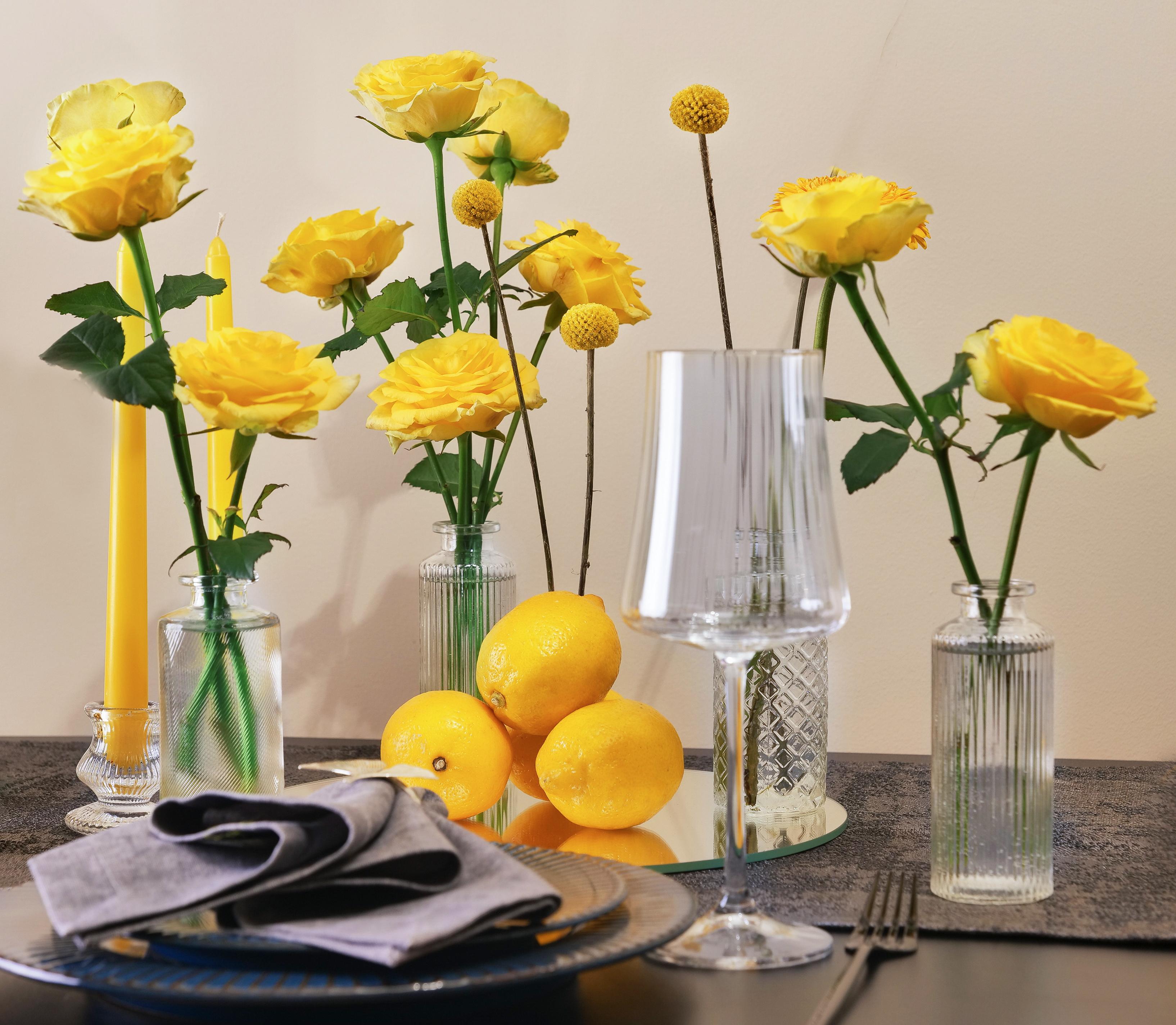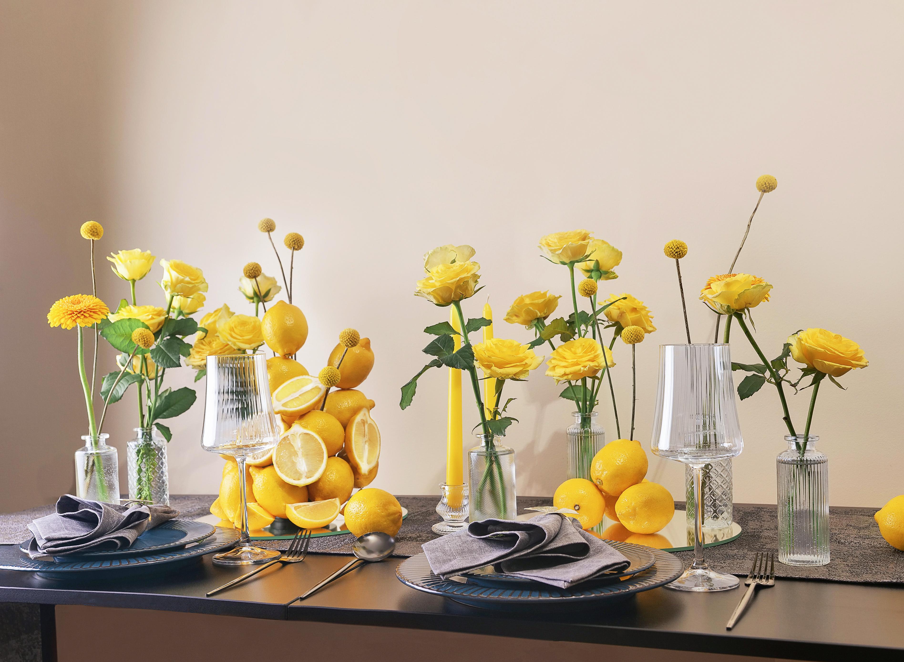 Насыщенные композиции, где сочные лимоны играют главную роль, а цветы — изящную партию. Размер композиции 100х30 см, высотой 30 см. В аренду входит: Сервировочная тканевая дорожка; Два зеркала 30х30 см; Стеклянные вазы; Восковые свечи в стеклянных подсвечниках.