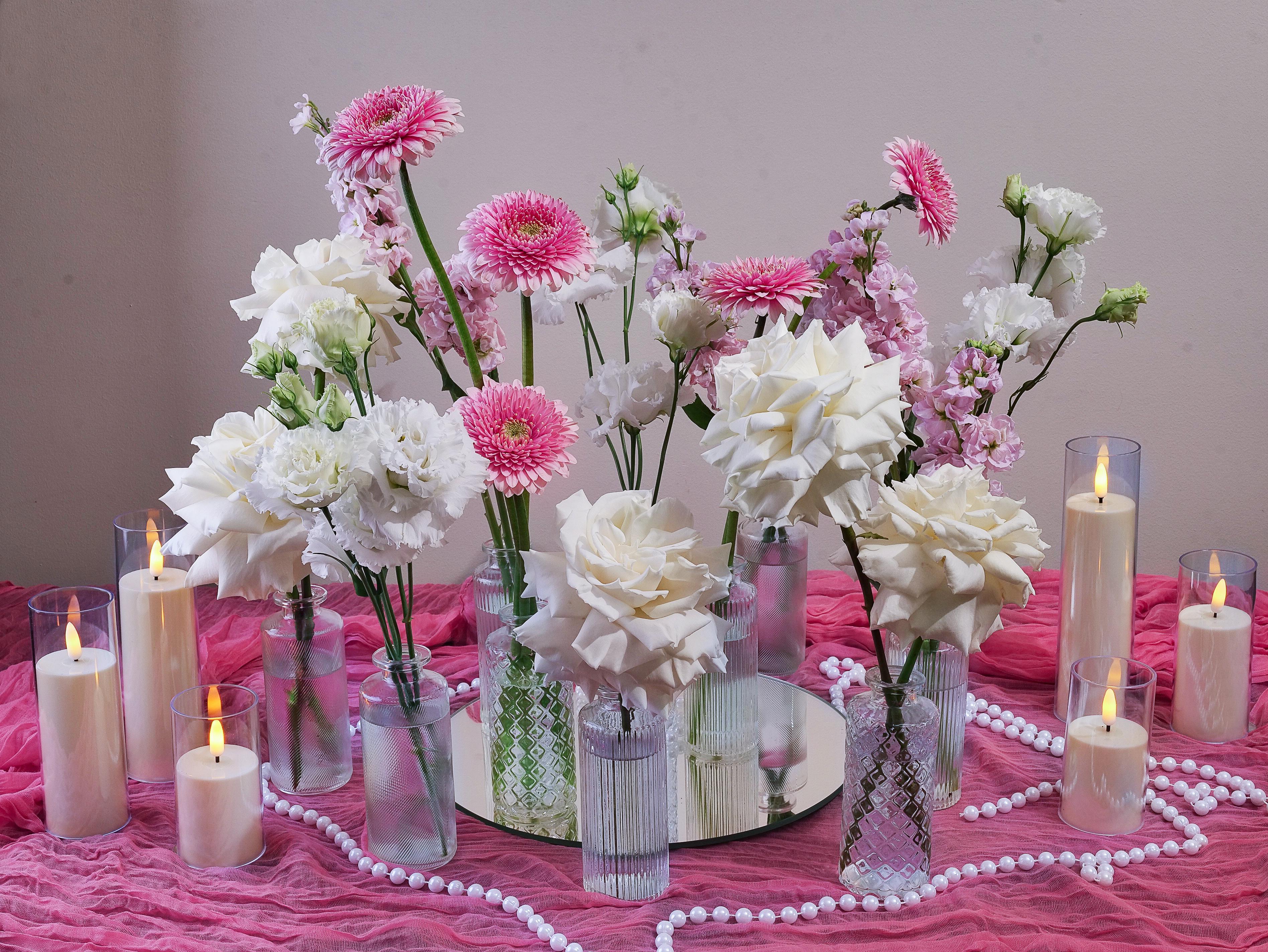 Ваш стол будет украшен небольшими вазочками с цвети выбранной цветовой гаммы. Размер композиции 40х40 см, высотой 30 см. В аренду входит: Сервировочная тканевая дорожа; Зеркало 30х30 см; Жемчужная лента; Электронные свечи; Стеклянные вазы.